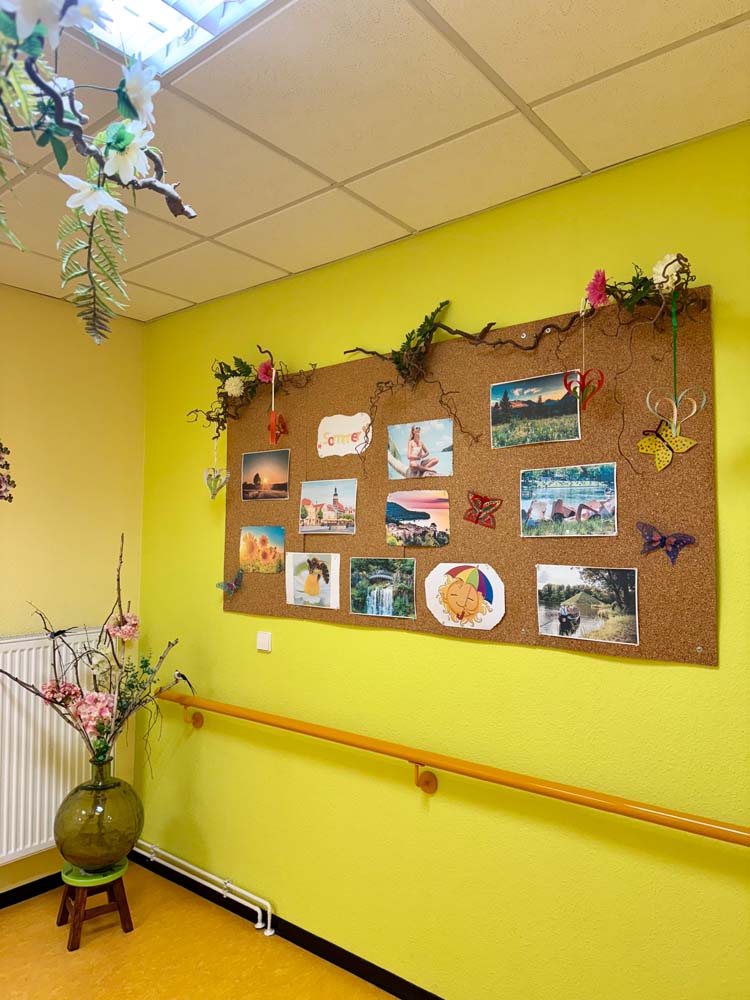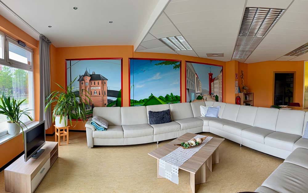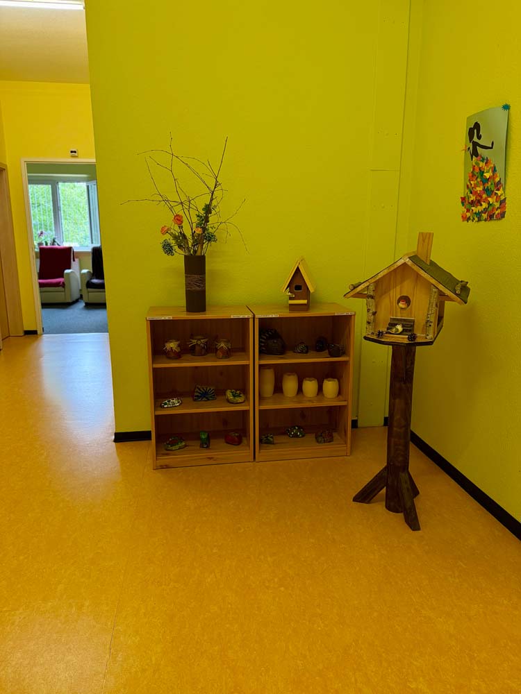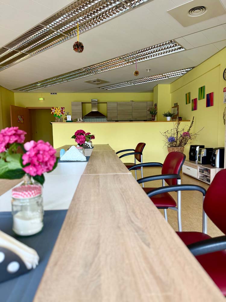 Es stehen 25 Plätze in einer modernen und barrierefreien Einrichtung zur Verfügung. Diese besteht aus zwei Wohnküchen, zwei Wohnräumen, zwei Ruheräumen, einer Kreativwerkstatt und behinderten gerechten WC. Alle Räume sind liebevoll eingerichtet.